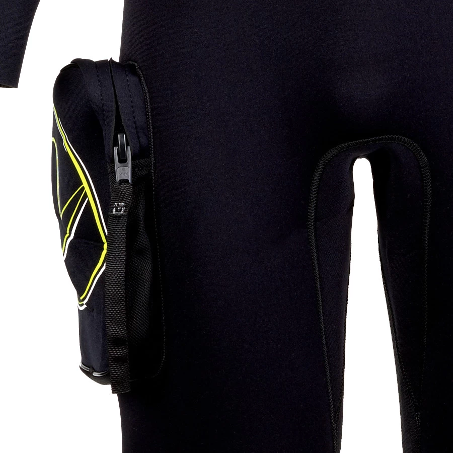 – Du néoprène compressé de 4 mm est utilisé sur l’ensemble du vêtement. Il offre une grande chaleur, conserve son épaisseur même lors de plongées profondes et limite la flottabilité.