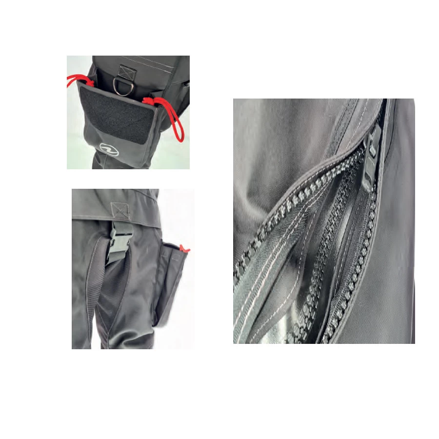 – La sangle d’entre jambe et les bretelles réglables maintiennent la combinaison en place.